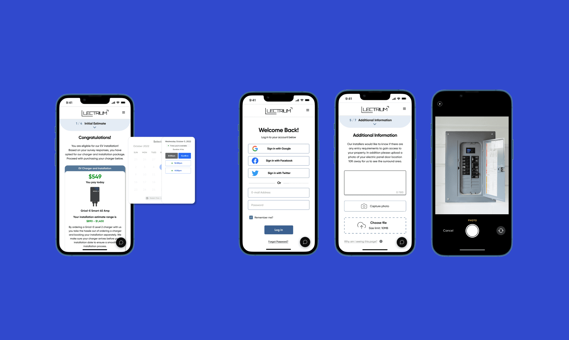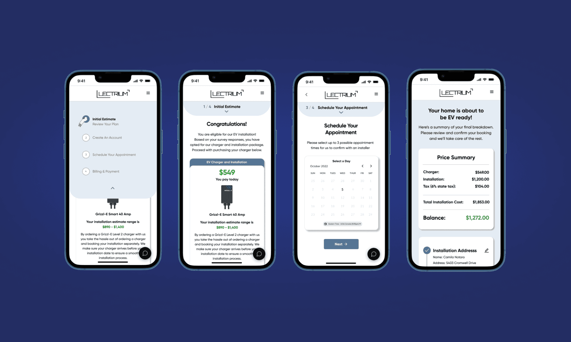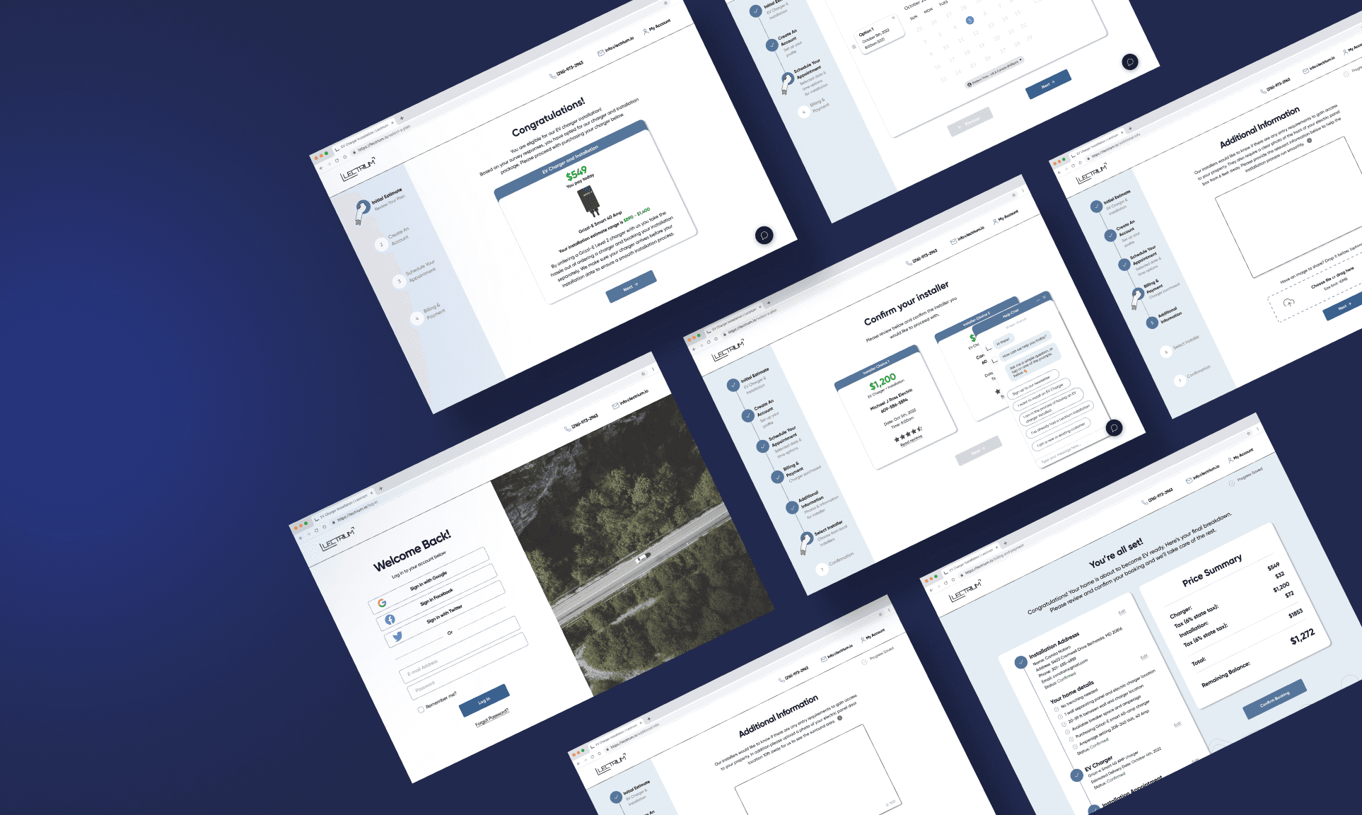 Lectrium is a full-service platform for electric vehicle home charging that simplifies the installation process through transparent pricing, certified electricians, and smart scheduling. Currently, homeowners complete an online survey to determine eligibility, and Lectrium manages the remainder of the process through email follow-ups. The goal of this project was to transform that fragmented journey into a seamless post-survey experience—guiding users from eligibility to booking confirmation directly within the web platform across both desktop and mobile.