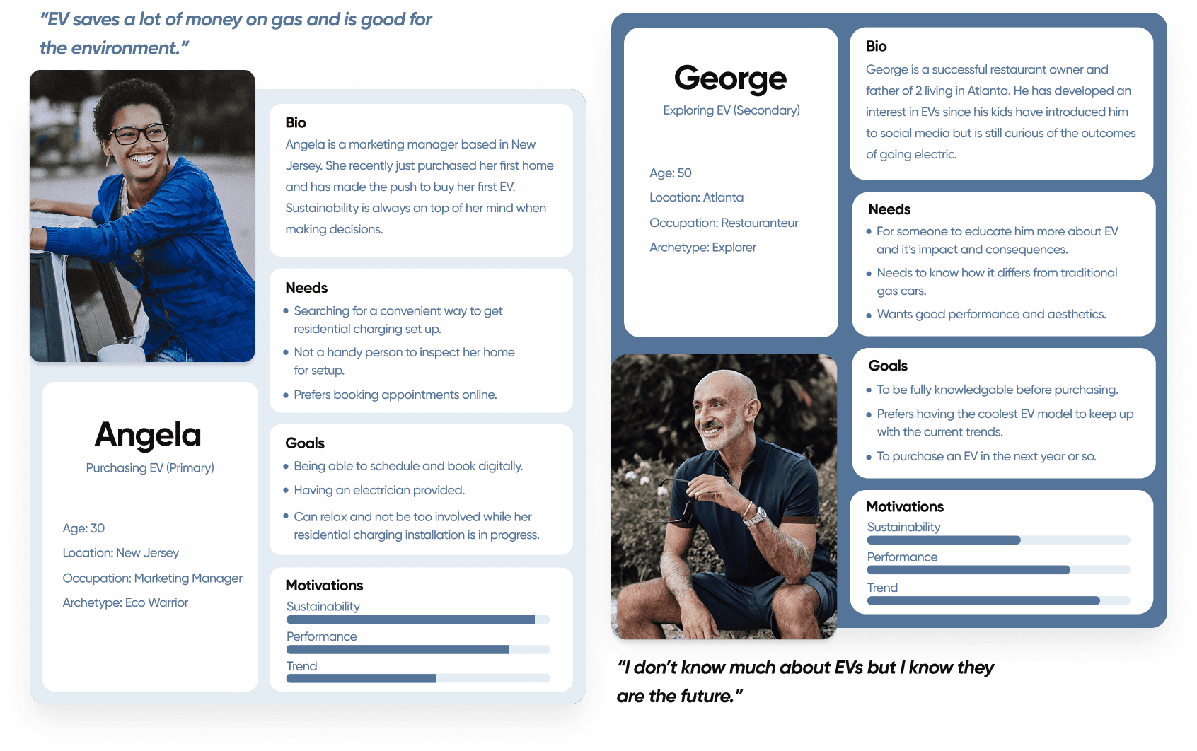 Lectrium has 2 target users they are aiming to reach for their service. We have user 1 Angela, who is purchasing an EV or has one and is looking to set up at-home charging. Then we have user 2 George, who is interested and exploring EV and curious to learn more.