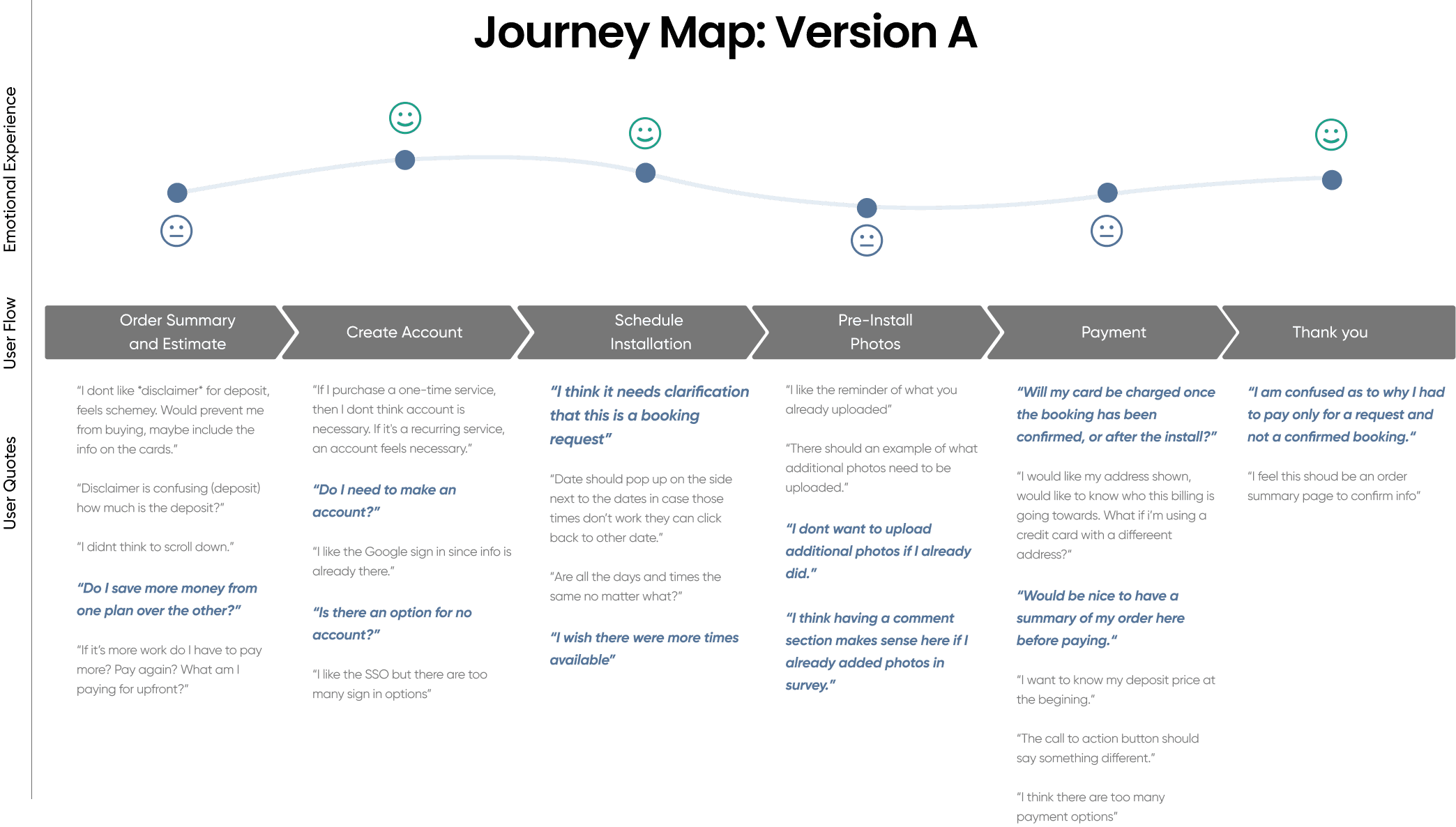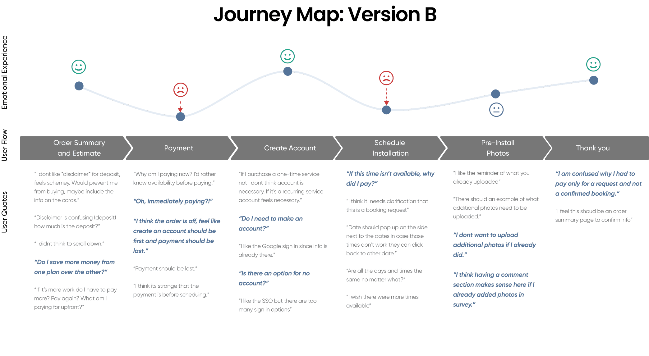We compared two onboarding journey flows with different payment and scheduling sequences to satisfy business and customers needs. While Version B introduced an earlier deposit step to streamline backend operations, it created confusion and negatively impacted user confidence and emotional experience. Users questioned why payment was required before selecting a time and confirming their booking. Based on these insights, we aligned with stakeholders to move forward with Version A, refining the flow using user feedback before advancing to high-fidelity prototyping.