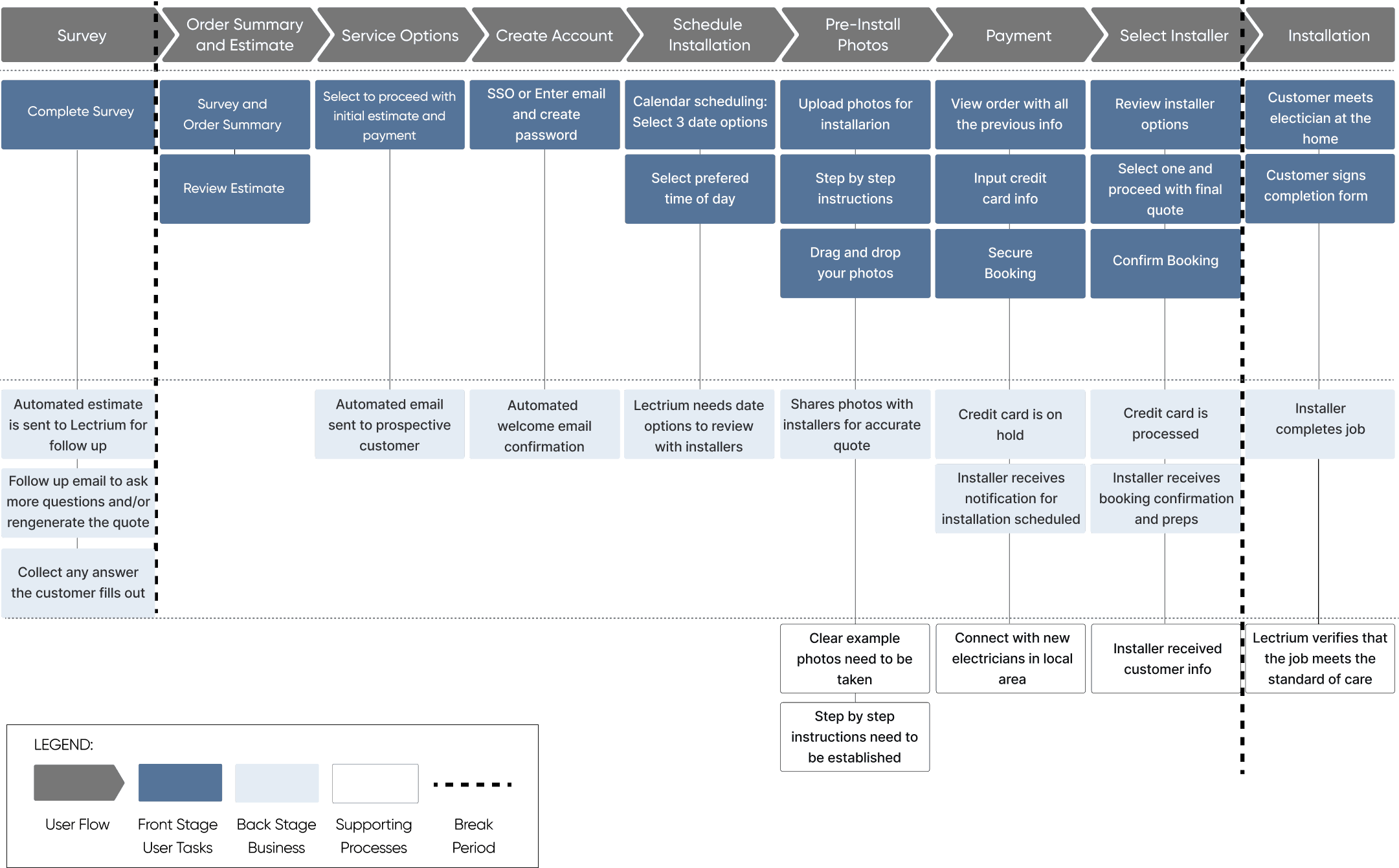In order for us to build an effective user flow, we needed to understand how Lectrium’s service operates. We created a service blueprint to help us get an overview of the front end to back end operations. Our next step would be to conduct usability tests based off this flow and identify opportunities for improvement in the customer journey.