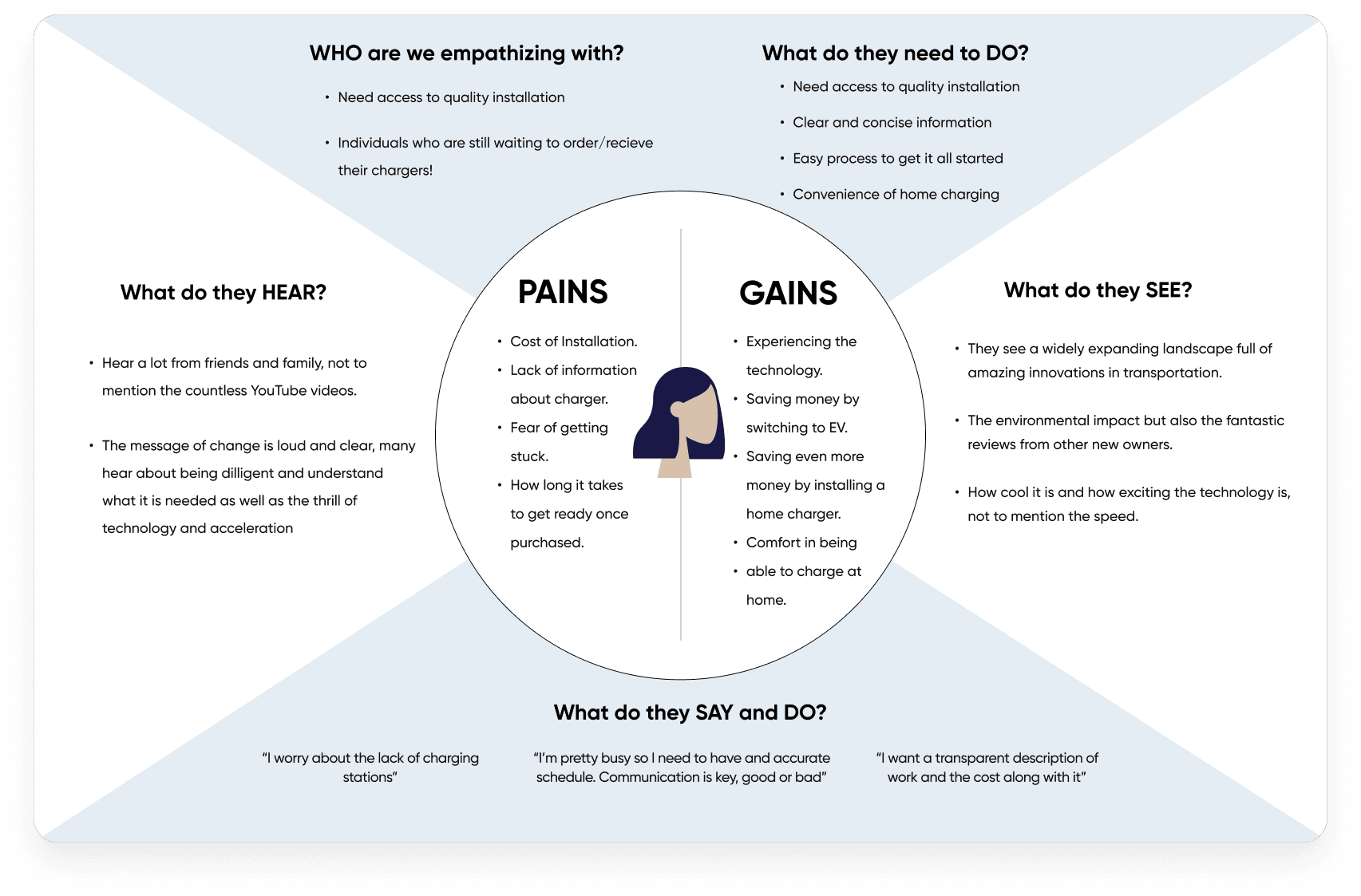 After conducting 8 rounds of user interviews, we created an empathy map to better understand our customer needs. Empathy mapping helped me realize what users think, say, do and feel can be different. I observed their behaviors as they navigated through the current website to collect data which enabled me to think from the user's perspective.